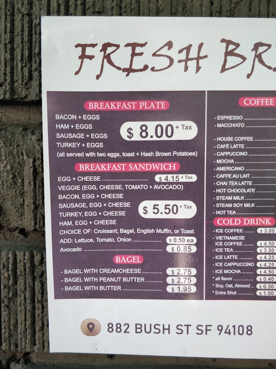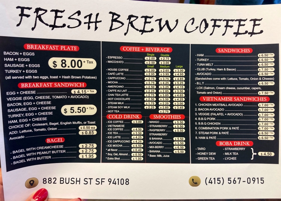 Welcome to Fresh Brew Coffee, a charming café nestled in the heart of San Francisco at 882 Bush St. Whether you’re a local looking for your go-to coffee spot or a visitor seeking a cozy corner to sip and savor, Fresh Brew Coffee offers an inviting atmosphere and a delectable menu that leaves a lasting impression.